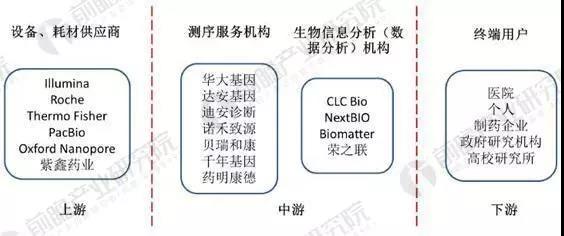 基因測序產(chǎn)業(yè)鏈主要由上游基因測序設(shè)備制造廠商、中游測序服務(wù)機(jī)構(gòu)及生物信息分析機(jī)構(gòu)和下游醫(yī)院、制藥企業(yè)、高校研究所等構(gòu)成。
